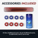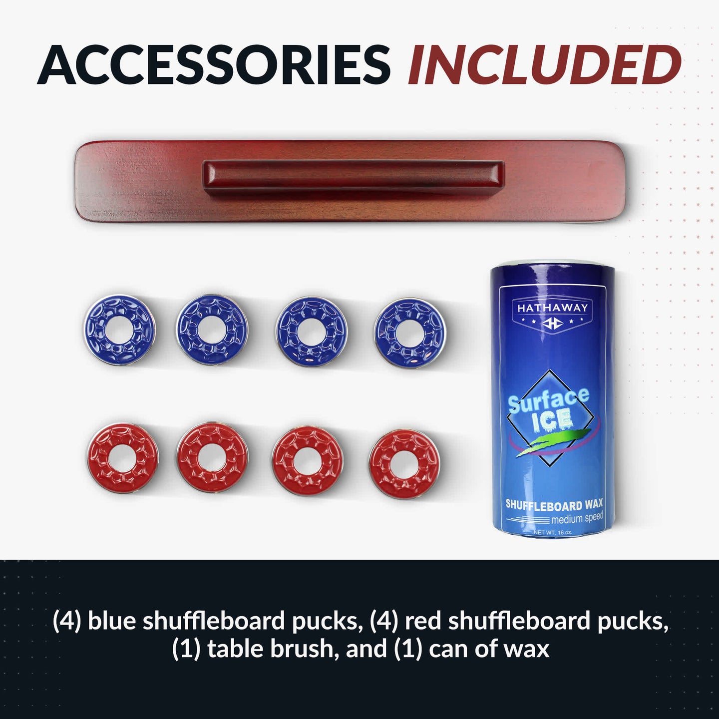 Includes accessory kit: four blue shuffleboard pucks, four red shuffleboard pucks, one table brush, and one can of wax